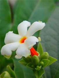 Beautiful white with a coral orange stalk. I am seeing this after nearly twenty two years. When I set my eyes on this I am back to my child hood. Though then the tree did not seem as fascinating as I could not climb it like I could climb the sampige tree next to it.