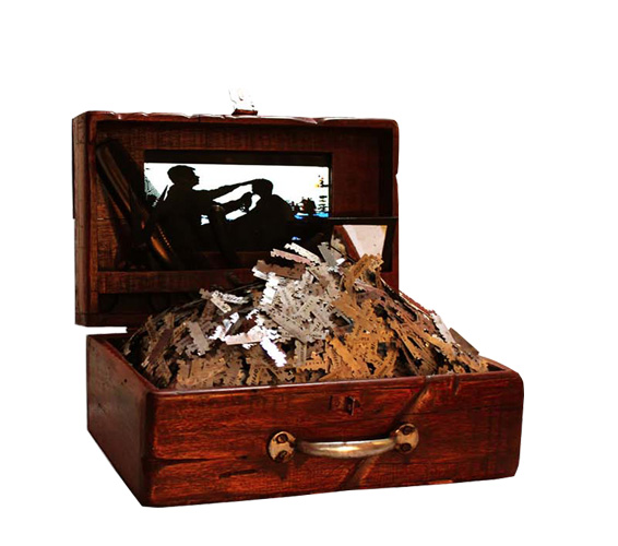 Bhikari Thakur himself was a barber, a barber was seen close to his patron, as he heard them narrate stories and happenings as they shaved their beards. These were intimate accounts to which he was sworn to secrecy. This intimacy appears as forewarnings in the plays of Thakur. Men stayed away from their wives for years while working in Calcutta, it was only natural for them to visit prostitutes or their wives to finds affections in the arms of other men in the village. Illegitimacy and marital dispute began to plague the villages of Arrah and Chapra. Bhikari in Bidesiya urges the wayward man to return home using songs and humour soothing the hurt, in Putrabadh he critiques the banality of inquiring about the legitimacy of a child. Bhikari instead critiques the reasons behind the migration. Scenes of an Indian city are projected in a Barbers Box, by Naresh Kumar, as he builds the maps of Bihar, India and the World using rusting razor blades, to narrate the complex nature of geography that now defines the Bihari identity.