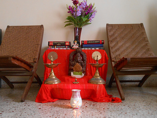 The Bommbe Habba traditionally begins on the first day of Navaratri, after kalasa Avahanam, or the ritualistic welcome of the three manifestations of the divine mother, Saraswati, Parwati and Lakshmi. Then wooden planks of odd numbers that 3-5-7-9-11 are kept. This is the mettalu or stairs. On which a sari is draped. Over this the deity is placed on the highest plank, and thematic arrangements are made on different planks. Stories from the Puranas, or royal processions, village or temple layouts and other everyday scenes are done.